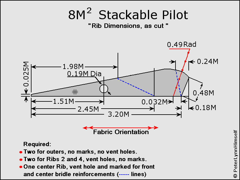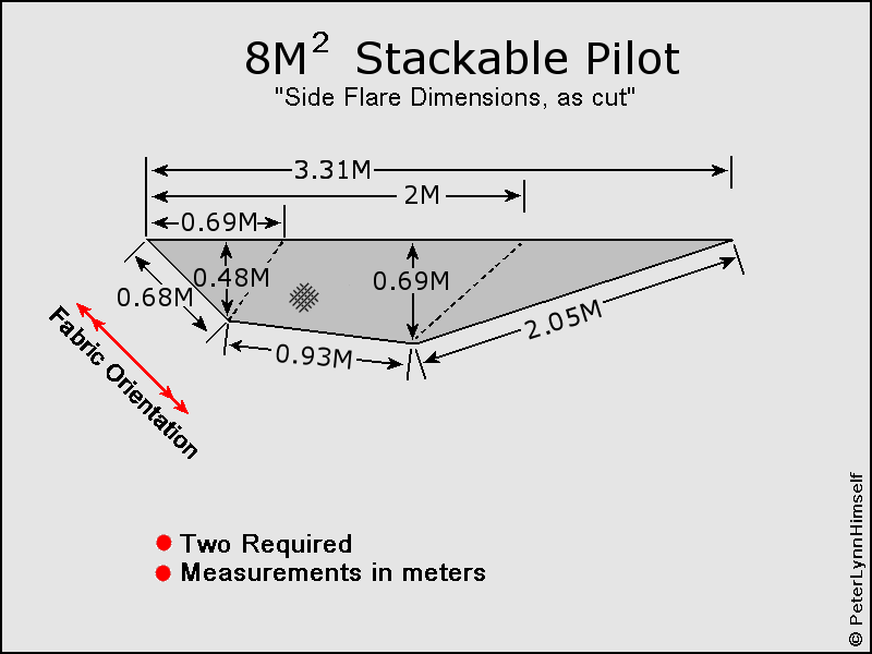 What I can offer is plans for a developed 3 bridle 8sq.m Pilot. It's actually 8.5sq.m flat, probably a bit less than 8sq.m when flying.- and please take note , this design doesn't scale. (no soft kites do). If you make a different size it will behave differently- especially with regard to the volatile instability/superstability balance.
