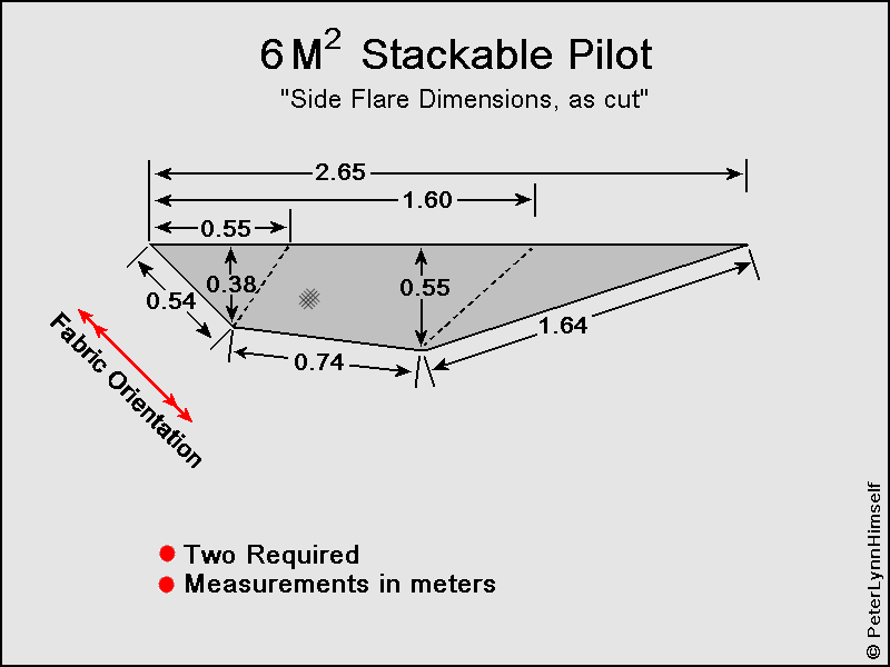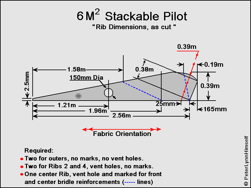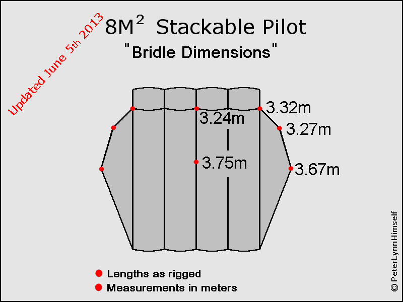 Attached are dimensioned plans (ably drawn up from my sketches by Robert van Weers) for my latest pilot design. It's a 6 sq.m 4 cell 8 bridle stackable design that is the most reliable, widest wind range single line kite I've ever developed. It has a bit more pull for it's size, but it's angle of flight is very slightly down in comparison to more performance orientated pilot designs. Three of them stacked are an excellent replacement for the 22 sq.m 4 bridle pilots we generally now use for banner lifting- and a lot easier to launch and fly . Left/right tuning is set by adjusting the relative lengths of the side "B" bridles (same as for the original PL 8 bridle series pilots), and "B" centre can be lengthened up to 200mm for less pull in very strong conditions and for a slight improvement at the light end.