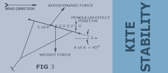 Superstability can also be caused by a kite's centre of pressure (where the lift forces act) being too close to its centre of gravity (where its weight acts). This dimension is the length of the pendulum that causes kites to be upward seeking. When this 'pendulum' is very short, it's correcting moment becomes inadequate, and in the time it takes for any lean to correct, the kite will have moved across to one edge of the wind. This dimension also has a profound connection to volatile instability- but it's not a simple relationship. When it is very large in proportion to a kite's size (difficult to achieve without hanging weights off the tail), flight will be stable but often jerky, and at a low line angle. Between the extremes of too short and too long, there is usually a zone when a kite is neither volatile unstable nor superstable, but I don't know of any quantitative method for determining this.